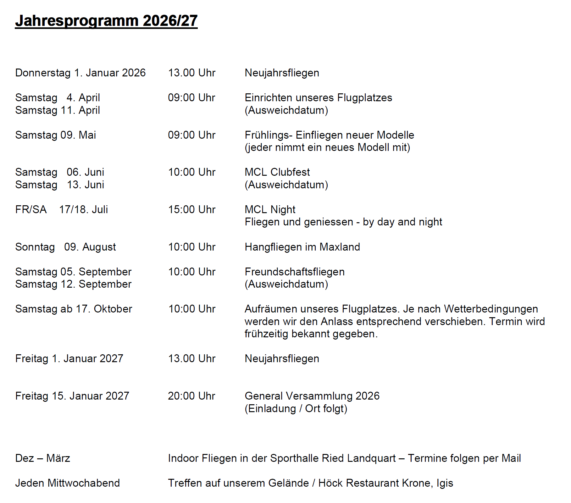 Die kalte und nässere Jahreszeit steht vor der Türe. Am Mittwochabend steht nun unser gemütlicher Höck ab ca. 19:30Uhr im Restaurant Krone in Igis an. Bei schönem Wetter kann selbstverständlich jeden Tag auf dem Platz geflogen werden.